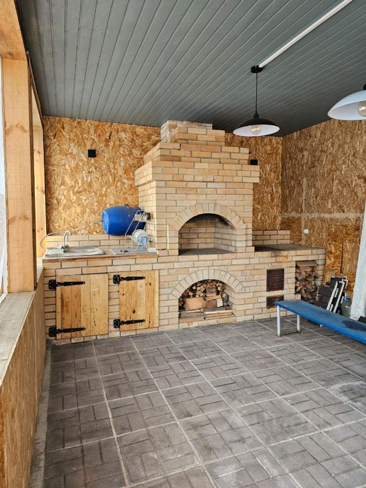 • Беседка 6м 4,15 м на ленточном фундаменте, пол плитка, стены обшиты имитацией кирпича. Печка в беседке длиной 4 м, в ней мойка, зона для мангала и зона для казана. Электричество заведено.